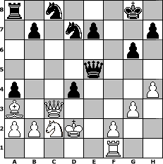 game notation in PGN-format [Event "960 Chess Fun"] [Site "www.myChess.de"] [Date "2006.03.14"] [Round "1"] [White "Antaeus"] [Black "bane"] [Variant "Fischerrandom"] [SetUp "1"] [FEN "nrnqkrbb/pppppppp/8/8/8/8/PPPPPPPP/NRNQKRBB w KQkq - 0 1"] [WhitemyELO "1809"] [BlackmyELO "1905"] [Result "0-1"] [TimeControl "10/864000"] [WhiteDays "10"] [BlackDays "10"] [MyChessNo "23581"] 1. f4 f5 2. Bc5 Bc4 3. d3 Bd5 4. c4 Be6 5. g3 d6 6. Ba3 c6 7. Qa4 Nab6 8. Qb3 g6 9. e3 Qc7 10. Ne2 Bf6 11. Nc2 a5 12. h4 a4 13. Qb4 Ra8 14. Bf3 c5 15. Qd2 d5 16. cxd5 Bxd5 17. Bxd5 Nxd5 18. e4 fxe4 19. dxe4 Ndb6 20. Rd1 O-O 21. e5 Bg7 22. Qc3 Nd7 23. Ned4 Bxe5 24. fxe5 Qxe5+ 25. Kd2 Rxf1 26. Rxf1 cxd4 0-1 position notation in FEN-format r1n3k1/1p1np2p/6p1/4q3/p2p3P/B1Q3P1/PPNK1P2/5R2 - - - 0 27 Captured white pieces: Captured black pieces: Click on a captured piece in order to display the desired move!