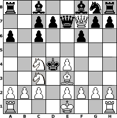 game notation in PGN-format [Event "In Memorium Michael Knopf 4"] [Site "www.myChess.de"] [Date "2015.04.10"] [Round "1"] [White "miu"] [Black "MiFie"] [ECO "C68"] [WhitemyELO "1590"] [BlackmyELO "1076"] [Result "1-0"] [TimeControl "10/2592000"] [WhiteDays "60"] [BlackDays "51"] [MyChessNo "98912"] 1. e4 e5 2. Nf3 Nc6 3. Bb5 a6 4. Bxc6 bxc6 5. Nxe5 f6 6. Qh5+ Ke7 7. Qf7+ Kd6 8. Nc4+ Kc5 9. d4+ Kxd4 10. Nc3 Qe7 11. Be3# 1-0 position notation in FEN-format r1b2bnr/2ppqQpp/p1p2p2/8/2NkP3/2N1B3/PPP1PPPP/R3K2R - KQ - 3 11 Captured white pieces: ![]() ![]() ![]() ![]() ![]() ![]() ![]() ![]() ![]() ![]() ![]() ![]() ![]() ![]() ![]() Captured black pieces: ![]() ![]() ![]() ![]() ![]() ![]() ![]() ![]() ![]() ![]() ![]() ![]() ![]() ![]() ![]() Click on a captured piece in order to display the desired move!