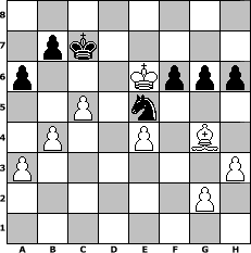 game notation in PGN-format [Event "MySchachOpen"] [Site "www.myChess.de"] [Date "2005.01.22"] [Round "2"] [White "bjeu"] [Black "UPS"] [ECO "B20"] [WhitemyELO "1667"] [BlackmyELO "1638"] [Result "1-0"] [TimeControl "10/2592000"] [WhiteDays "119"] [BlackDays "096"] [MyChessNo "9941"] 1. e4 c5 2. c4 Nc6 3. f4 e6 4. Nc3 d6 5. Nf3 Be7 6. d4 cxd4 7. Nxd4 a6 8. Be3 Nf6 9. Be2 O-O 10. O-O Qc7 11. a3 Rd8 12. b4 e5 13. Nc2 exf4 14. Bxf4 Ne5 15. Ne3 Be6 16. Ncd5 Bxd5 17. Nxd5 Nxd5 18. Qxd5 Bf6 19. Be3 Rac8 20. Rac1 Qc6 21. Qxc6 Nxc6 22. Bg4 Ra8 23. Rc2 Bd4 24. Bxd4 Nxd4 25. Rd2 Nc6 26. Rfd1 Ne5 27. Be2 Kf8 28. Rxd6 Rxd6 29. Rxd6 Ke7 30. c5 Rc8 31. Kf2 Rc7 32. Ke3 Rd7 33. Rxd7+ Kxd7 34. Kd4 f6 35. Kd5 g6 36. h3 h6 37. Bg4+ Kc7 38. Ke6 1-0 position notation in FEN-format 8/1pk5/p3Kppp/2P1n3/1P2P1B1/P6P/6P1/8 - - - 3 38 Captured white pieces: Captured black pieces: Click on a captured piece in order to display the desired move!