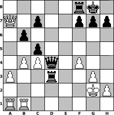 game notation in PGN-format [Event "friends 4"] [Site "www.myChess.de"] [Date "2007.07.20"] [Round "2"] [White "Andylein1989"] [Black "Shubaka"] [ECO "C42"] [WhitemyELO "1463"] [BlackmyELO "1500"] [Result "1/2-1/2"] [TimeControl "10/864000"] [WhiteDays "10"] [BlackDays "10"] [MyChessNo "36591"] 1. e4 e5 2. Nf3 Nf6 3. d3 Bc5 4. Nxe5 d6 5. Nc4 Nc6 6. Be2 O-O 7. O-O Be6 8. Nbd2 Qd7 9. Nb3 Bxc4 10. Nxc5 dxc5 11. dxc4 Qe6 12. Bd3 Rad8 13. f3 Nb4 14. a3 Nxd3 15. cxd3 Rd7 16. Qa4 b6 17. Qxa7 Qe5 18. Rd1 Qd4+ 19. Kf1 Qe5 20. g3 Qh5 21. Kg2 Nxe4 22. Bf4 Ng5 23. Bxg5 Qxg5 24. f4 Qf6 25. b4 Qb2+ 26. Kg1 Rxd3 27. Rdb1 Qd4+ 28. Kg2 1/2-1/2 position notation in FEN-format 5rk1/Q1p2ppp/1p6/2p5/1PPq1P2/P2r2P1/6KP/RR6 - - - 3 28 Captured white pieces: Captured black pieces: Click on a captured piece in order to display the desired move!
