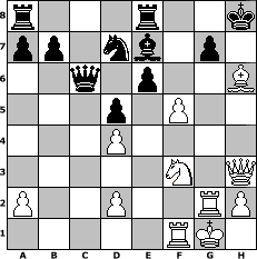 game notation in PGN-format [Event "In diesem Sommer gehts noch mal heiss her"] [Site "www.myChess.de"] [Date "2024.07.20"] [Round "1"] [White "Leon"] [Black "deepsabel"] [ECO "D00"] [WhitemyELO "1869"] [BlackmyELO "1779"] [Result "1-0"] [TimeControl "10/2592000"] [WhiteDays "90"] [BlackDays "84"] [MyChessNo "132135"] 1. d4 d5 2. e3 Nf6 3. Nc3 Bf5 4. Bd3 Bxd3 5. Qxd3 c6 6. Nf3 e6 7. e4 Bb4 8. e5 Ne4 9. O-O Nxc3 10. bxc3 Be7 11. Rb1 Qc7 12. Ng5 h6 13. Qh3 Nd7 14. f4 O-O 15. Nf3 c5 16. g4 cxd4 17. cxd4 Qxc2 18. Rb2 Qc6 19. f5 exf5 20. gxf5 Rfe8 21. Rg2 Kh8 22. e6 fxe6 23. Bxh6 1-0 position notation in FEN-format r3r2k/pp1nb1p1/2q1p2B/3p1P2/3P4/5N1Q/P2P2RP/5RK1 - - - 0 23 Captured white pieces: Captured black pieces: Click on a captured piece in order to display the desired move!