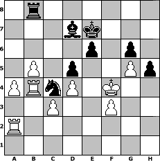 game notation in PGN-format [Event "Schach im Mittelalter: Tugend der Ritter"] [Site "www.myChess.de"] [Date "2016.12.17"] [Round "1"] [White "deepsabel"] [Black "Joschi"] [ECO "A48"] [WhitemyELO "2025"] [BlackmyELO "1591"] [Result "1/2-1/2"] [TimeControl "10/2592000"] [WhiteDays "150"] [BlackDays "150"] [MyChessNo "106044"] 1. d4 Nf6 2. Nf3 g6 3. Nc3 d5 4. Bf4 c6 5. e3 Bg7 6. Be2 Nbd7 7. Ne5 O-O 8. h4 e6 9. h5 c5 10. Qd2 cxd4 11. exd4 a6 12. O-O-O b5 13. hxg6 fxg6 14. Bh6 Qe7 15. Nc6 Qf7 16. Rh2 Bxh6 17. Qxh6 Qg7 18. Rdh1 Qxh6+ 19. Rxh6 Bb7 20. Ne5 Rad8 21. Bd3 Rfe8 22. Nxd7 Rxd7 23. Nxb5 axb5 24. Bxb5 Ree7 25. Bxd7 Rxd7 26. R6h4 Ne4 27. f3 Nd6 28. Re1 Re7 29. g4 Nb5 30. c3 Bc8 31. a4 Nd6 32. b3 Rf7 33. Rh3 Ne8 34. Kc2 Nf6 35. Kd3 Ba6+ 36. Ke3 Rc7 37. Rc1 Kg7 38. Rh2 h5 39. g5 Ne8 40. b4 Nd6 41. b5 Nc4+ 42. Kf4 Bc8 43. Ra2 Rb7 44. Re1 Kf7 45. Kg3 Bd7 46. Rb1 Ke7 47. Kf4 Rb8 48. Rb4 1/2-1/2 position notation in FEN-format 1r6/3bk3/4p1p1/1P1p2Pp/PRnP1K2/2P2P2/R7/8 - - - 14 48 Captured white pieces: Captured black pieces: Click on a captured piece in order to display the desired move!
