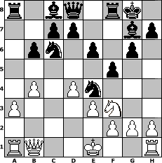 game notation in PGN-format [Event "Loyal to the Game"] [Site "www.myChess.de"] [Date "2005.12.23"] [Round "1"] [White "Andi56"] [Black "Andreas"] [ECO "A46"] [WhitemyELO "931"] [BlackmyELO "1641"] [Result "0-1"] [TimeControl "10/864000"] [WhiteDays "03"] [BlackDays "09"] [MyChessNo "20998"] 1. d4 Nf6 2. Nf3 e6 3. Nc3 g6 4. e3 Bg7 5. Nb5 a6 6. Bc4 axb5 7. Bd2 bxc4 8. b3 cxb3 9. cxb3 O-O 10. Ba5 Rxa5 11. Qd2 Nc6 12. b4 Ra8 13. a3 Ne4 14. Qd1 b6 15. Qb1 f5 0-1 position notation in FEN-format r1bq1rk1/2pp2bp/1pn1p1p1/5p2/1P1Pn3/P3PN2/5PPP/RQ2K2R - KQ - 0 16 Captured white pieces: Captured black pieces: Click on a captured piece in order to display the desired move!