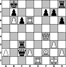 game notation in PGN-format [Event "dezember turnier"] [Site "www.myChess.de"] [Date "2005.12.05"] [Round "1"] [White "Sanji"] [Black "Juri"] [ECO "A00"] [WhitemyELO "1341"] [BlackmyELO "1562"] [Result "1-0"] [TimeControl "10/2592000"] [WhiteDays "093"] [BlackDays "118"] [MyChessNo "20361"] 1. d3 e5 2. f4 d6 3. Nf3 exf4 4. Bxf4 Nc6 5. e4 Bg4 6. Be2 Bxf3 7. Bxf3 Nd4 8. O-O Nf6 9. Be3 Nxf3+ 10. Qxf3 h6 11. d4 Qe7 12. Nc3 O-O-O 13. Rfe1 c6 14. e5 dxe5 15. dxe5 Nd7 16. Bxa7 Nxe5 17. Qf5+ Qd7 18. Qxe5 Bd6 19. Qa5 Bc7 20. Qa4 Qd6 21. g3 Qg6 22. Bf2 Bd6 23. b4 Kd7 24. Rad1 Ra8 25. Qb3 Kc7 26. b5 Ra3 27. b6+ Kb8 28. Qc4 Qxc2 29. Rxd6 Rxc3 30. Qf4 1-0 position notation in FEN-format 1k5r/1p3pp1/1PpR3p/8/5Q2/2r3P1/P1qP1B1P/4R1K1 - - - 1 30 Captured white pieces: Captured black pieces: Click on a captured piece in order to display the desired move!