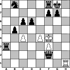 game notation in PGN-format [Event "Auf bessere Zeiten!!"] [Site "www.myChess.de"] [Date "2020.05.07"] [Round "1"] [White "borsti"] [Black "faustballer"] [ECO "C41"] [WhitemyELO "1214"] [BlackmyELO "1492"] [Result "0-1"] [TimeControl "10/864000"] [WhiteDays "35"] [BlackDays "40"] [MyChessNo "118241"] 1. e4 e5 2. Nf3 d6 3. Bb5+ c6 4. Ba4 a5 5. a3 b5 6. Bb3 h6 7. Nc3 Nf6 8. d3 Be7 9. O-O a4 10. Ba2 Bg4 11. h3 Bh5 12. Be3 O-O 13. Ne2 Nh7 14. d4 Bxf3 15. gxf3 Bg5 16. Bxg5 Nxg5 17. Ng3 Nxh3+ 18. Kh2 Nf4 19. Rh1 Qd7 20. Kg1 Qe7 21. Nf5 Qg5+ 22. Ng3 h5 23. Qd2 Nh3+ 24. Rxh3 Qxd2 25. Bb1 Qg5 26. Rxh5 Qc1+ 27. Nf1 Qxb2 28. c4 Qxa1 29. Bc2 Qxa3 30. Rh3 exd4 31. Kg2 Qc3 32. Bb1 a3 33. Ne3 dxe3 34. fxe3 Qxe3 35. Rh1 a2 36. Bxa2 Rxa2+ 37. Kg3 Qf2+ 38. Kf4 Ra3 0-1 position notation in FEN-format 1n3rk1/5pp1/2pp4/1p6/2P1PK2/r4P2/5q2/7R - - - 4 39 Captured white pieces: Captured black pieces: Click on a captured piece in order to display the desired move!