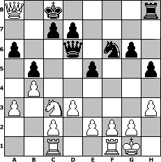game notation in PGN-format [Event "MY HAIR IS ON FIRE!"] [Site "www.myChess.de"] [Date "2020.03.29"] [Round "2"] [White "faustballer"] [Black "Hobbykegler"] [ECO "C23"] [WhitemyELO "1511"] [BlackmyELO "988"] [Result "1-0"] [TimeControl "10/2592000"] [WhiteDays "30"] [BlackDays "30"] [MyChessNo "117841"] 1. e4 e5 2. Bc4 Qe7 3. Nf3 Nc6 4. d3 Nf6 5. a3 a6 6. b4 b5 7. Ba2 g6 8. Nc3 Bb7 9. Ng5 O-O-O 10. Nxf7 Nd4 11. Nxh8 Bg7 12. Nf7 Re8 13. Ng5 h5 14. O-O Bh6 15. Nf3 Nxf3+ 16. Qxf3 Bxc1 17. Raxc1 Rh8 18. Bd5 Bxd5 19. exd5 Ng4 20. h3 Nf6 21. d6 Qxd6 22. Qa8# 1-0 position notation in FEN-format Q1k4r/2pp4/p2q1np1/1p2p2p/1P6/P1NP3P/2P1PPP1/2R2RK1 - - - 1 22 Captured white pieces: Captured black pieces: Click on a captured piece in order to display the desired move!