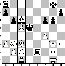 game notation in PGN-format [Event "Fr"] [Site "www.myChess.de"] [Date "2008.02.07"] [Round "2"] [White "muellerh"] [Black "Grubengeist"] [ECO "A15"] [WhitemyELO "1554"] [BlackmyELO "1962"] [Result "0-1"] [TimeControl "10/2592000"] [WhiteDays "62"] [BlackDays "68"] [MyChessNo "42447"] 1. c4 Nf6 2. d4 g6 3. Nc3 d5 4. c5 Nc6 5. Nf3 Bg7 6. e3 O-O 7. Be2 Bg4 8. O-O Re8 9. h3 Bf5 10. a3 Ne4 11. Bd2 e5 12. dxe5 Nxc5 13. Rc1 Nd3 14. Bxd3 Bxd3 15. Re1 Nxe5 16. Nxe5 Bxe5 17. f4 Bf6 18. Na4 Bh4 19. Bc3 Bxe1 20. Qxe1 Bb5 21. Nc5 b6 22. Nb3 c5 23. Qf2 f6 24. Qh4 d4 25. exd4 Qd5 26. dxc5 Re2 27. Qg3 Bc6 0-1 position notation in FEN-format r5k1/p6p/1pb2pp1/2Pq4/5P2/PNB3QP/1PP1r1P1/2R3K1 - - - 3 28 Captured white pieces: ![]() ![]() ![]() ![]() ![]() ![]() ![]() ![]() ![]() ![]() ![]() ![]() ![]() ![]() ![]() Captured black pieces: ![]() ![]() ![]() ![]() ![]() ![]() ![]() ![]() ![]() ![]() ![]() ![]() ![]() ![]() ![]() Click on a captured piece in order to display the desired move!