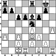 game notation in PGN-format [Event "2.HSF-Clubmeisterschaften 2011/12 Gruppe B"] [Site "www.myChess.de"] [Date "2011.09.01"] [Round "1"] [White "woern63"] [Black "leitsgeheier"] [ECO "C45"] [WhitemyELO "1898"] [BlackmyELO "1625"] [Result "1/2-1/2"] [TimeControl "10/2592000"] [WhiteDays "30"] [BlackDays "10"] [MyChessNo "75988"] 1. e4 e5 2. Nf3 Nc6 3. d4 exd4 4. Nxd4 Nge7 5. Nc3 Nxd4 6. Qxd4 Nc6 7. Qe3 Bb4 8. Bd2 O-O 9. a3 Ba5 10. Qg3 d6 11. O-O-O Re8 12. h4 h6 13. Bxh6 Bxc3 14. bxc3 Qf6 15. Bg5 Qe5 16. Qxe5 Nxe5 17. f3 Be6 18. Bb5 c6 19. Bf1 f6 20. Be3 1/2-1/2 position notation in FEN-format r3r1k1/pp4p1/2ppbp2/4n3/4P2P/P1P1BP2/2P1P1P1/2KR1B1R - - - 1 20 Captured white pieces: ![]() ![]() ![]() ![]() ![]() ![]() ![]() ![]() ![]() ![]() ![]() ![]() ![]() ![]() ![]() Captured black pieces: ![]() ![]() ![]() ![]() ![]() ![]() ![]() ![]() ![]() ![]() ![]() ![]() ![]() ![]() ![]() Click on a captured piece in order to display the desired move!