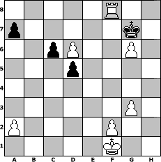 game notation in PGN-format [Event "gro"] [Site "www.myChess.de"] [Date "2005.01.21"] [Round "2"] [Board "3"] [White "Dragonwolves"] [Black "Andreas"] [ECO "C42"] [WhitemyELO "1879"] [BlackmyELO "1581"] [Result "1-0"] [TimeControl "10/2592000"] [WhiteDays "30"] [BlackDays "30"] [MyChessNo "9793"] 1. e4 e5 2. Nf3 Nf6 3. Nxe5 d6 4. Nf3 Nxe4 5. d4 d5 6. Bd3 Bd6 7. O-O O-O 8. c4 c6 9. c5 Bc7 10. Re1 Re8 11. Nc3 Nxc3 12. Rxe8+ Qxe8 13. bxc3 Bg4 14. Bd2 Nd7 15. Bxh7+ Kf8 16. h3 Nf6 17. hxg4 Nxh7 18. Qb1 Nf6 19. g5 Ne4 20. Qxb7 Qc8 21. Rb1 g6 22. g3 Bd8 23. Bf4 Nxc3 24. Ne5 Qxb7 25. Rxb7 Ne2+ 26. Kf1 Nxd4 27. Rxf7+ Ke8 28. Rh7 Ne6 29. Rh8+ Nf8 30. Nxg6 Be7 31. Bd6 Bxd6 32. cxd6 Kf7 33. Nxf8 Rxf8 34. g6+ Kg7 35. Rxf8 1-0 position notation in FEN-format 5R2/p5k1/2pP2P1/3p4/8/6P1/P4P2/5K2 - - - 0 35 Captured white pieces: Captured black pieces: Click on a captured piece in order to display the desired move!