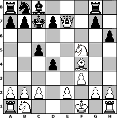 game notation in PGN-format [Event "F"] [Site "www.myChess.de"] [Date "2012.10.18"] [Round "1"] [White "Cuibono"] [Black "Caligula"] [ECO "C21"] [WhitemyELO "1545"] [BlackmyELO "1399"] [Result "1-0"] [TimeControl "10/864000"] [WhiteDays "10"] [BlackDays "07"] [MyChessNo "84530"] 1. e4 e5 2. d4 exd4 3. Nf3 c5 4. Bc4 h6 5. Ne5 Qe7 6. Nxf7 Qxe4+ 7. Kf1 Rh7 8. f3 Qf5 9. Qe1+ Be7 10. Nd6+ Kd8 11. Nxf5 Rh8 12. Bxg8 Rxg8 13. Qxe7+ Kc7 14. Bf4+ 1-0 position notation in FEN-format rnb3r1/ppkpQ1p1/7p/2p2N2/3p1B2/5P2/PPP1P1PP/RN3K1R - - - 2 14 Captured white pieces: Captured black pieces: Click on a captured piece in order to display the desired move!