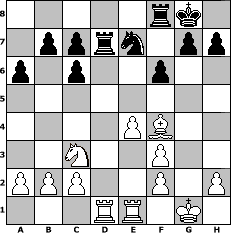 game notation in PGN-format [Event "Eine zentrale Er"] [Site "www.myChess.de"] [Date "2009.05.20"] [Round "2"] [White "ujack1961"] [Black "Andreas"] [ECO "C68"] [WhitemyELO "1565"] [BlackmyELO "1544"] [Result "1-0"] [TimeControl "10/2592000"] [WhiteDays "60"] [BlackDays "58"] [MyChessNo "55939"] 1. e4 e5 2. Nf3 Nc6 3. Bb5 a6 4. Bxc6 dxc6 5. O-O Bd6 6. d4 Bg4 7. dxe5 Bxe5 8. Qxd8+ Rxd8 9. Nxe5 Be2 10. Re1 f6 11. Nf3 Bxf3 12. gxf3 Ne7 13. Bf4 Rd7 14. Nc3 O-O 15. Rad1 1-0 position notation in FEN-format 5rk1/1pprn1pp/p1p2p2/8/4PB2/2N2P2/PPP2P1P/3RR1K1 - - - 6 15 Captured white pieces: Captured black pieces: Click on a captured piece in order to display the desired move!