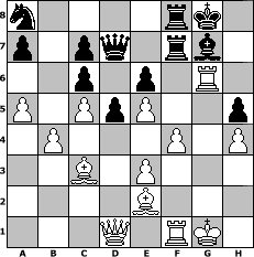 game notation in PGN-format [Event "960-2021-59- Geburtstagsturnier"] [Site "www.myChess.de"] [Date "2021.02.18"] [Round "1"] [White "Peterlie77 (C)"] [Black "alibengali"] [Variant "Fischerrandom"] [SetUp "1"] [FEN "nnrqbkrb/pppppppp/8/8/8/8/PPPPPPPP/NNRQBKRB w KQkq - 0 1"] [WhitemyELO "2180"] [BlackmyELO "1644"] [Result "1-0"] [TimeControl "10/2592000"] [WhiteDays "22"] [BlackDays "27"] [MyChessNo "121240"] 1. d4 d5 2. Nb3 Nb6 3. Na5 Bc6 4. g3 g6 5. O-O O-O 6. f4 Na4 7. b3 Nb6 8. a4 N8d7 9. Nxc6 bxc6 10. a5 Na8 11. c4 e6 12. c5 Rb8 13. e3 f5 14. Nd2 Qe7 15. Nf3 Bf6 16. Ne5 Nxe5 17. dxe5 Bg7 18. b4 Qd7 19. Bf3 Rfd8 20. Bc3 Kf7 21. g4 fxg4 22. Bxg4 Kg8 23. Rc2 Rf8 24. Rg2 Rf7 25. h4 h5 26. Be2 Rbf8 27. Rxg6 1-0 position notation in FEN-format n4rk1/p1pq1rb1/2p1p1R1/P1PpP2p/1P3P1P/2B1P3/4B3/3Q1RK1 - - - 0 27 Captured white pieces: ![]() ![]() ![]() ![]() ![]() ![]() ![]() ![]() ![]() ![]() ![]() ![]() ![]() ![]() ![]() Captured black pieces: ![]() ![]() ![]() ![]() ![]() ![]() ![]() ![]() ![]() ![]() ![]() ![]() ![]() ![]() ![]() Click on a captured piece in order to display the desired move!
