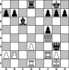 game notation in PGN-format [Event "1. Chess960/6"] [Site "www.myChess.de"] [Date "2007.03.01"] [Round "1"] [White "Isigkeit@"] [Black "GPogrzeba@ (adv.)"] [Variant "Fischerrandom"] [SetUp "1"] [FEN "rbqkbrnn/pppppppp/8/8/8/8/PPPPPPPP/RBQKBRNN w KQkq - 0 1"] [WhitemyELO "1500"] [BlackmyELO "1500"] [Result "1/2-1/2"] [TimeControl "10/3456000"] [WhiteDays "093"] [BlackDays "107"] [MyChessNo "33164"] 1. Nf3 Nf6 2. Ng3 c5 3. c4 Bxg3 4. hxg3 d6 5. d4 cxd4 6. Nxd4 Bd7 7. Bc3 O-O 8. O-O Qxc4 9. Bd3 Qd5 10. Nc2 Ng6 11. Ne3 Qh5 12. Bxf6 exf6 13. Qc7 Bc6 14. Qxd6 Rad8 15. Qb4 Ne5 16. Rfd1 Rfe8 17. Rd2 Nxd3 18. exd3 Qg5 19. Re1 f5 20. Red1 Rxe3 21. fxe3 Qxe3+ 22. Rf2 Qxg3 23. Qf4 1/2-1/2 position notation in FEN-format 3r2k1/pp3ppp/2b5/5p2/5Q2/3P2q1/PP3RP1/3R2K1 - - - 1 23 Captured white pieces: Captured black pieces: Click on a captured piece in order to display the desired move!