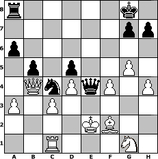 game notation in PGN-format [Event "1. Fr"] [Site "www.myChess.de"] [Date "2009.02.01"] [Round "1"] [White "mkauf"] [Black "Tomino"] [ECO "A06"] [WhitemyELO "1520"] [BlackmyELO "1649"] [Result "0-1"] [TimeControl "10/864000"] [WhiteDays "32"] [BlackDays "14"] [MyChessNo "52261"] 1. Nf3 d5 2. d4 Nf6 3. c4 c6 4. Nc3 a6 5. cxd5 cxd5 6. Bg5 Ne4 7. Bh4 Qa5 8. Qb3 e6 9. a3 Nc6 10. e3 Bb4 11. Rc1 Bxc3+ 12. bxc3 b5 13. Bd3 f5 14. Nd2 Nxd2 15. Kxd2 O-O 16. f4 Bd7 17. h3 Be8 18. g4 Bg6 19. g5 Bh5 20. Bf2 Bf3 21. Rh2 Qb6 22. h4 Na5 23. Qb4 Bh5 24. Be2 Nc4+ 25. Kd3 Bg4 26. Bxg4 fxg4 27. Rg2 e5 28. Rxg4 Qg6+ 29. Ke2 exf4 30. Rxf4 Rxf4 31. exf4 Qe4+ 0-1 position notation in FEN-format r5k1/6pp/p7/1p1p2P1/1QnPqP1P/P1P5/4KB2/2R3N1 - - - 1 32 Captured white pieces: ![]() ![]() ![]() ![]() ![]() ![]() ![]() ![]() ![]() ![]() ![]() ![]() ![]() ![]() ![]() Captured black pieces: ![]() ![]() ![]() ![]() ![]() ![]() ![]() ![]() ![]() ![]() ![]() ![]() ![]() ![]() ![]() Click on a captured piece in order to display the desired move!