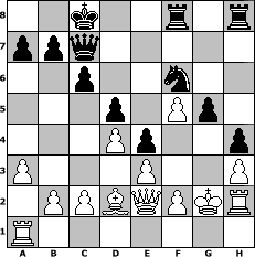 game notation in PGN-format [Event "Weihnachtsturnier 2012"] [Site "www.myChess.de"] [Date "2012.12.18"] [Round "1"] [White "Seneca"] [Black "Grubengeist"] [ECO "D00"] [WhitemyELO "1466"] [BlackmyELO "1956"] [Result "1-0"] [TimeControl "10/864000"] [WhiteDays "10"] [BlackDays "00"] [MyChessNo "85535"] 1. d4 d5 2. e3 Bf5 3. Nc3 Nf6 4. Bd3 e6 5. Bxf5 exf5 6. Nf3 c6 7. a3 Nbd7 8. O-O Bd6 9. Bd2 Ne4 10. h3 g5 11. g3 h5 12. Kg2 h4 13. Nxe4 fxe4 14. Nh2 f5 15. g4 Qc7 16. Rh1 O-O-O 17. gxf5 Rdf8 18. Qg4 Nf6 19. Qe2 Bxh2 20. Rxh2 1-0 position notation in FEN-format 2k2r1r/ppq5/2p2n2/3p1Pp1/3Pp2p/P3P2P/1PPBQPKR/R7 - - - 0 20 Captured white pieces: Captured black pieces: Click on a captured piece in order to display the desired move!