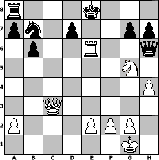 game notation in PGN-format [Event "Neue Reihe: sch"] [Site "www.myChess.de"] [Date "2009.05.15"] [Round "2"] [White "deepsabel"] [Black "Grubengeist"] [ECO "C52"] [WhitemyELO "1977"] [BlackmyELO "1968"] [Result "1-0"] [TimeControl "10/2592000"] [WhiteDays "30"] [BlackDays "27"] [MyChessNo "55752"] 1. e4 e5 2. Nf3 Nc6 3. Bc4 Bc5 4. b4 Bxb4 5. c3 Ba5 6. d4 exd4 7. O-O dxc3 8. Qb3 Qf6 9. e5 Qf5 10. Nxc3 Nge7 11. Ba3 O-O 12. Rad1 Bb6 13. Nd5 Nxd5 14. Rxd5 Qf4 15. Bxf8 Kxf8 16. Re1 Na5 17. Qb4+ c5 18. Rxc5 Bxc5 19. Qxc5+ Ke8 20. Bd5 Nc6 21. Re4 Qh6 22. h4 b6 23. Qc3 Bb7 24. Ng5 Nd8 25. Bxb7 Nxb7 26. e6 fxe6 27. Rxe6+ 1-0 position notation in FEN-format r3k3/pn1p2pp/1p2R2q/6N1/7P/2Q5/P3PPP1/6K1 - - - 0 27 Captured white pieces: ![]() ![]() ![]() ![]() ![]() ![]() ![]() ![]() ![]() ![]() ![]() ![]() ![]() ![]() ![]() Captured black pieces: ![]() ![]() ![]() ![]() ![]() ![]() ![]() ![]() ![]() ![]() ![]() ![]() ![]() ![]() ![]() Click on a captured piece in order to display the desired move!