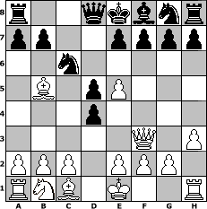 game notation in PGN-format [Event "3. HSF-Clubturnier - A-Finale"] [Site "www.myChess.de"] [Date "2013.03.16"] [Round "1"] [White "mizuho"] [Black "Duschgel"] [ECO "B10"] [WhitemyELO "1538"] [BlackmyELO "1574"] [Result "0-1"] [TimeControl "10/2592000"] [WhiteDays "11"] [BlackDays "30"] [MyChessNo "87161"] 1. e4 c6 2. Nf3 d5 3. e5 Bg4 4. d4 c5 5. h3 Bxf3 6. Bb5+ Nc6 7. Qxf3 cxd4 0-1 position notation in FEN-format r2qkbnr/pp2pppp/2n5/1B1pP3/3p4/5Q1P/PPP1PPP1/RNB1K2R - KQkq - 0 8 Captured white pieces: ![]() ![]() ![]() ![]() ![]() ![]() ![]() ![]() ![]() ![]() ![]() ![]() ![]() ![]() ![]() Captured black pieces: ![]() ![]() ![]() ![]() ![]() ![]() ![]() ![]() ![]() ![]() ![]() ![]() ![]() ![]() ![]() Click on a captured piece in order to display the desired move!