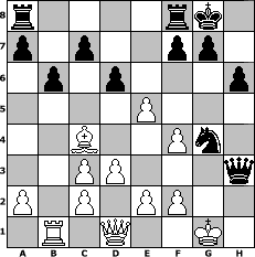 game notation in PGN-format [Event "FSO1-1-45"] [Site "www.myChess.de"] [Date "2005.05.26"] [Round "2"] [White "Hobbykegler"] [Black "genesimmons"] [ECO "C47"] [WhitemyELO "1047"] [BlackmyELO "1509"] [Result "0-1"] [TimeControl "10/2592000"] [WhiteDays "27"] [BlackDays "29"] [MyChessNo "13602"] 1. e4 e5 2. Nf3 Nc6 3. Nc3 Nf6 4. Bc4 Bc5 5. O-O O-O 6. d3 h6 7. Re1 d6 8. Be3 Bxe3 9. Rxe3 Nd4 10. Nxd4 exd4 11. Rf3 dxc3 12. bxc3 Bg4 13. h3 Bxf3 14. gxf3 Qd7 15. Rb1 b6 16. f4 Qxh3 17. e5 Ng4 0-1 position notation in FEN-format r4rk1/p1p2pp1/1p1p3p/4P3/2B2Pn1/2PP3q/P1P1PP2/1R1Q2K1 - - - 1 18 Captured white pieces: Captured black pieces: Click on a captured piece in order to display the desired move!
