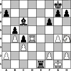 game notation in PGN-format [Event "10. Wikinger-Klubmeisterschaft"] [Site "www.myChess.de"] [Date "2014.04.29"] [Round "2"] [White "Haneken"] [Black "baltruma"] [ECO "B20"] [WhitemyELO "1068"] [BlackmyELO "1663"] [Result "0-1"] [TimeControl "10/2592000"] [WhiteDays "30"] [BlackDays "27"] [MyChessNo "94179"] 1. e4 c5 2. d3 e6 3. Be2 Nc6 4. Nf3 d5 5. O-O Nf6 6. e5 Nd7 7. Bg5 Be7 8. Bxe7 Qxe7 9. Nc3 Ndxe5 10. d4 cxd4 11. Nb5 Nc4 12. Bxc4 dxc4 13. Nfxd4 e5 14. Re1 Nxd4 15. Nxd4 O-O 16. c3 Qg5 17. Nf3 Qf4 18. Rxe5 Bg4 19. Qd4 Qxd4 20. Nxd4 f6 21. Re7 Rf7 22. Re4 Bd7 23. Nf3 b5 24. b4 Bc6 25. Rd4 Re8 26. Nh4 Rfe7 27. g4 Re1+ 28. Rxe1 Rxe1# 0-1 position notation in FEN-format 6k1/p5pp/2b2p2/1p6/1PpR2PN/2P5/P4P1P/4r1K1 - - - 0 29 Captured white pieces: Captured black pieces: Click on a captured piece in order to display the desired move!
