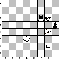 game notation in PGN-format [Event "Entdeckung der Langsamkeit III"] [Site "www.myChess.de"] [Date "2013.03.15"] [Round "1"] [White "Seneca"] [Black "Duschgel"] [ECO "E60"] [WhitemyELO "1530"] [BlackmyELO "1569"] [Result "1/2-1/2"] [TimeControl "10/3456000"] [WhiteDays "224"] [BlackDays "222"] [MyChessNo "87074"] 1. d4 Nf6 2. c4 g6 3. e3 Bg7 4. Bd3 O-O 5. Nf3 d5 6. O-O c5 7. dxc5 Qc7 8. Nc3 Qxc5 9. cxd5 Nxd5 10. Nxd5 Qxd5 11. Qc2 Bg4 12. Be4 Qb5 13. h3 Rc8 14. Qd1 Bf5 15. Bxf5 Qxf5 16. Qb3 Nc6 17. Bd2 Na5 18. Qb4 Nc4 19. Bc3 Bxc3 20. Qxc3 Nd6 21. Qe5 Qxe5 22. Nxe5 Rc2 23. b3 Ne4 24. a3 Rac8 25. f3 Nd2 26. Rfd1 Nxb3 27. Rab1 R8c3 28. e4 Nc5 29. a4 Ra3 30. Rdc1 Rxc1+ 31. Rxc1 Rxa4 32. Rxc5 a5 33. Rb5 Ra1+ 34. Kh2 a4 35. Rxb7 Kf8 36. Kg3 a3 37. Ra7 a2 38. Kf4 Kg7 39. Ng4 h5 40. Ne3 e5+ 41. Kxe5 Re1 42. Nc2 Re2 43. Rxa2 Rxg2 44. Nb4 Rg3 45. Rf2 Rxh3 46. Kf4 Rh1 47. Rg2 Rf1 48. Nd5 f6 49. Ne3 g5+ 50. Kg3 Rh1 51. f4 g4 52. e5 Rh3+ 53. Kf2 Rf3+ 54. Ke2 Rxf4 55. exf6+ Rxf6 56. Kd3 Kg6 57. Nxg4 1/2-1/2 position notation in FEN-format 8/8/5rk1/7p/6N1/3K4/6R1/8 - - - 0 57 Captured white pieces: Captured black pieces: Click on a captured piece in order to display the desired move!
