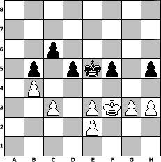 game notation in PGN-format [Event "Schach dem" Nikolaus""] [Site "www.myChess.de"] [Date "2009.11.28"] [Round "1"] [White "bluescreenlover"] [Black "Steffi"] [ECO "C44"] [WhitemyELO "1313"] [BlackmyELO "1546"] [Result "1-0"] [TimeControl "10/2592000"] [WhiteDays "92"] [BlackDays "51"] [MyChessNo "60984"] 1. e4 e5 2. Nf3 Nc6 3. b3 Nf6 4. Nc3 Bb4 5. Bc4 d6 6. Bb2 Bxc3 7. Bxc3 Nxe4 8. Bb2 Nf6 9. O-O O-O 10. d4 Qe7 11. h3 exd4 12. Nxd4 Nxd4 13. Bxd4 c6 14. Re1 Qd8 15. Qf3 d5 16. Bd3 Be6 17. Bxf6 Qxf6 18. Qxf6 gxf6 19. Re3 Kh8 20. Rf3 f5 21. Bxf5 Bxf5 22. Rxf5 Rae8 23. Kf1 Re7 24. Re1 Rfe8 25. Rxe7 Rxe7 26. Rf3 a6 27. Rd3 Kg8 28. Re3 Rxe3 29. fxe3 f5 30. g3 Kf7 31. Kf2 Kf6 32. Kf3 Ke5 33. a3 h5 34. c3 b6 35. a4 b5 36. axb5 axb5 37. b4 1-0 position notation in FEN-format 8/8/2p5/1p1pkp1p/1P6/2P1PKPP/4P3/8 - - - 0 37 Captured white pieces: Captured black pieces: Click on a captured piece in order to display the desired move!