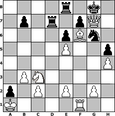 game notation in PGN-format [Event "Milde2"] [Site "www.myChess.de"] [Date "2013.05.17"] [Round "1"] [White "lmilde1 (adv.)"] [Black "pepo47"] [ECO "B41"] [WhitemyELO "1522"] [BlackmyELO "2073"] [Result "1-0"] [TimeControl "10/3456000"] [WhiteDays "137"] [BlackDays "158"] [MyChessNo "88361"] 1. e4 c5 2. Nf3 e6 3. d4 cxd4 4. Nxd4 Nf6 5. Nc3 d6 6. Bc4 Be7 7. Bb3 Na6 8. f4 Nc5 9. e5 dxe5 10. fxe5 Nfd7 11. Bf4 a6 12. Qh5 Nxb3 13. axb3 Nf8 14. O-O-O Qa5 15. Qf3 Ng6 16. Nc6 Qa1+ 17. Nb1 O-O 18. Nxe7+ Nxe7 19. Bd2 a5 20. Rhf1 Nd5 21. Qg3 Ne7 22. h4 h5 23. Bh6 Ng6 24. Qg5 Bd7 25. Bxg7 Qxb2+ 26. Kxb2 a4 27. Rxd7 a3+ 28. Ka1 a2 29. Nc3 Rad8 30. Qh6 Rfe8 31. Bf6 Rxd7 32. Qg7# 1-0 position notation in FEN-format 4r1k1/1p1r1pQ1/4pBn1/4P2p/7P/1PN5/p1P1P1P1/K4R2 - - - 1 32 Captured white pieces: Captured black pieces: Click on a captured piece in order to display the desired move!