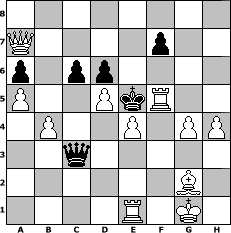 game notation in PGN-format [Event "Herbstturnier 2025"] [Site "www.myChess.de"] [Date "2025.09.16"] [Round "1"] [White "Yukiki"] [Black "Achimkogge"] [ECO "C21"] [WhitemyELO "1542"] [BlackmyELO "1215"] [Result "1-0"] [TimeControl "10/1728000"] [WhiteDays "74"] [BlackDays "97"] [MyChessNo "133659"] 1. e4 e5 2. d4 Bb4+ 3. c3 Bd6 4. d5 Nf6 5. Bg5 h6 6. Bxf6 Qxf6 7. Nd2 b5 8. Bxb5 a6 9. Bd3 Bc5 10. Ngf3 d6 11. b4 Bb6 12. Nc4 Qf4 13. g3 Qg4 14. h3 Qd7 15. Bf1 Ba7 16. Bg2 g5 17. g4 Qb5 18. Nfd2 Nd7 19. a4 Qb8 20. Na5 Qb6 21. O-O Nf6 22. Ndc4 Qb8 23. Nc6 Qb7 24. N4a5 Qb6 25. Qf3 Bd7 26. Qxf6 O-O 27. Qxh6 Bxc6 28. Qxg5+ Kh7 29. Nxc6 Rg8 30. Qf6 Rg7 31. Qh4+ Kg8 32. Ne7+ Kf8 33. Qh8+ Rg8 34. Qxg8+ Kxe7 35. Qxa8 Kf6 36. a5 Qb5 37. Qxa7 Qc4 38. Rac1 c6 39. h4 Qe2 40. Rce1 Qc4 41. f4 Qxc3 42. fxe5+ Kxe5 43. Rf5# 1-0 position notation in FEN-format 8/Q4p2/p1pp4/P2PkR2/1P2P1PP/2q5/6B1/4R1K1 - - - 1 43 Captured white pieces: Captured black pieces: Click on a captured piece in order to display the desired move!