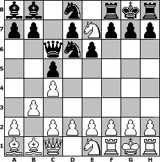 game notation in PGN-format [Event "1.) MySchach-960-Mannschaftsturnier 2012"] [Site "www.myChess.de"] [Date "2012.10.25"] [Round "1"] [Board "2"] [White "nyffhans"] [Black "Haneken"] [Variant "Fischerrandom"] [SetUp "1"] [FEN "bbqnnrkr/pppppppp/8/8/8/8/PPPPPPPP/BBQNNRKR w KQkq - 0 1"] [WhitemyELO "2003"] [BlackmyELO "1564"] [Result "1-0"] [TimeControl "10/2592000"] [WhiteDays "30"] [BlackDays "27"] [MyChessNo "84670"] 1. c4 c5 2. b3 Qc6 3. Ne3 Nd6 4. Nd5 e6 5. Ne7# 1-0 position notation in FEN-format bb1n1rkr/pp1pNppp/2qnp3/2p5/2P5/1P6/P1PPPPPP/BBQ1NRKR - KQkq - 1 5 Captured white pieces: Captured black pieces: Click on a captured piece in order to display the desired move!