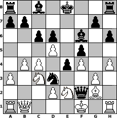 game notation in PGN-format [Event "Netzwerk Vulkaneifel"] [Site "www.myChess.de"] [Date "2021.11.05"] [Round "2"] [White "lotchi"] [Black "beowulf"] [ECO "A84"] [WhitemyELO "1295"] [BlackmyELO "1415"] [Result "0-1"] [TimeControl "10/1728000"] [WhiteDays "20"] [BlackDays "20"] [MyChessNo "123419"] 1. d4 f5 2. c4 Nf6 3. d5 e6 4. Nc3 d6 5. Bg5 Be7 6. g3 e5 7. e3 h6 8. Bxf6 Bxf6 9. f4 e4 10. Nge2 c6 11. Bg2 Na6 12. h4 Nc5 13. b4 Nd3+ 14. Kf1 Qb6 15. a3 Qxe3 16. Qb1 Qf2# 0-1 position notation in FEN-format r1b1k2r/pp4p1/2pp1b1p/3P1p2/1PP1pP1P/P1Nn2P1/3PNqB1/RQ3K1R - kq - 2 17 Captured white pieces: Captured black pieces: Click on a captured piece in order to display the desired move!