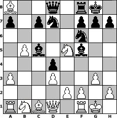 game notation in PGN-format [Event "4. Norderstedter DENK MAL Open 2013"] [Site "www.myChess.de"] [Date "2013.01.09"] [Round "1"] [White "Papale"] [Black "Steppenwolf"] [ECO "A00"] [WhitemyELO "1609"] [BlackmyELO "1178"] [Result "1-0"] [TimeControl "10/2592000"] [WhiteDays "25"] [BlackDays "26"] [MyChessNo "86073"] 1. g3 e5 2. Bg2 d5 3. d3 Nf6 4. Nf3 Nc6 5. O-O Bc5 6. c3 d4 7. c4 O-O 8. a3 Bf5 9. b4 Bd6 10. c5 Be7 11. b5 Nb8 12. Nxe5 Bxc5 13. Bxb7 Nbd7 14. Bxa8 1-0 position notation in FEN-format B2q1rk1/p1pn1ppp/5n2/1Pb1Nb2/3p4/P2P2P1/4PP1P/RNBQ1RK1 - - - 0 14 Captured white pieces: Captured black pieces: Click on a captured piece in order to display the desired move!