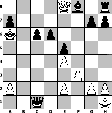 game notation in PGN-format [Event "Gegen die Herbstdepression"] [Site "www.myChess.de"] [Date "2008.12.01"] [Round "2"] [White "babikar"] [Black "rux"] [ECO "C50"] [WhitemyELO "1376"] [BlackmyELO "1378"] [Result "0-1"] [TimeControl "10/864000"] [WhiteDays "10"] [BlackDays "10"] [MyChessNo "50366"] 1. e4 e5 2. Nf3 Nc6 3. Bc4 d6 4. O-O Na5 5. b3 Nxc4 6. bxc4 Bg4 7. d3 Qf6 8. Bg5 Bxf3 9. Qxf3 Qxg5 10. Nc3 O-O-O 11. Qxf7 Nh6 12. Qe6+ Kb8 13. Rab1 c6 14. Qh3 Ng4 15. f3 Qe3+ 16. Kh1 Nf2+ 17. Rxf2 Qxf2 18. Qg3 Qxc2 19. Qe1 Qxd3 20. Na4 Qxc4 21. Qh4 Re8 22. Qg4 Kc7 23. Rxb7+ Kxb7 24. Qd7+ Ka6 25. Nc5+ Qxc5 26. Qxe8 Qc1# 0-1 position notation in FEN-format 4Qb1r/p5pp/k1pp4/4p3/4P3/5P2/P3P1PP/2q4K - - - 1 27 Captured white pieces: ![]() ![]() ![]() ![]() ![]() ![]() ![]() ![]() ![]() ![]() ![]() ![]() ![]() ![]() ![]() Captured black pieces: ![]() ![]() ![]() ![]() ![]() ![]() ![]() ![]() ![]() ![]() ![]() ![]() ![]() ![]() ![]() Click on a captured piece in order to display the desired move!