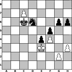 game notation in PGN-format [Event "Munich South Central"] [Site "www.myChess.de"] [Date "2010.10.19"] [Round "1"] [White "BobbyF4"] [Black "Gauss1233"] [ECO "B01"] [WhitemyELO "1439"] [BlackmyELO "1492"] [Result "0-1"] [TimeControl "10/864000"] [WhiteDays "30"] [BlackDays "59"] [MyChessNo "69115"] 1. e4 d5 2. exd5 Qxd5 3. Nc3 Qd6 4. d4 e5 5. Nb5 Qe7 6. d5 a6 7. d6 cxd6 8. Nc3 Nf6 9. Bc4 Be6 10. Bxe6 Qxe6 11. Nf3 Be7 12. Be3 O-O 13. O-O Nc6 14. Ng5 Qd7 15. h3 h6 16. Nge4 Nxe4 17. Nxe4 Rac8 18. Qd2 f5 19. Nc5 Qe8 20. Nxb7 Rb8 21. Nxd6 Bxd6 22. Qxd6 Rd8 23. Qa3 Ra8 24. Bc5 Rf7 25. c3 e4 26. Rad1 Rd7 27. Rxd7 Qxd7 28. Qb3+ Kh7 29. Rd1 Qc7 30. Bd6 Qc8 31. Qa4 Ra7 32. Qc4 Ne7 33. Qd4 Nc6 34. Qd5 Nd8 35. c4 Qc6 36. b4 Qxd5 37. Rxd5 Rd7 38. c5 g6 39. c6 Nxc6 40. a3 Nd8 41. a4 Nf7 42. b5 axb5 43. axb5 Rxd6 44. Rc5 Rb6 45. Kf1 Nd6 46. Rc6 Rxc6 47. bxc6 Kg7 48. Ke2 Kf6 49. Ke3 Ke5 50. f4+ Kd5 51. c7 Kc6 0-1 position notation in FEN-format 8/2P5/2kn2pp/5p2/4pP2/4K2P/6P1/8 - - - 1 52 Captured white pieces: Captured black pieces: Click on a captured piece in order to display the desired move!