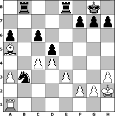game notation in PGN-format [Event "mal so"] [Site "www.myChess.de"] [Date "2013.12.02"] [Round "1"] [White "reisinger"] [Black "Mattheus"] [ECO "?"] [WhitemyELO "1518"] [BlackmyELO "1476"] [Result "0-1"] [TimeControl "10/1728000"] [WhiteDays "20"] [BlackDays "20"] [MyChessNo "91457"] 1. d4 Nf6 2. c4 e6 3. Nc3 Bb4 4. a3 Bxc3+ 5. bxc3 d5 6. Bf4 Nc6 7. Nf3 O-O 8. e3 Re8 9. cxd5 exd5 10. Bb5 Bg4 11. h3 Bxf3 12. Qxf3 a6 13. Bxc6 bxc6 14. O-O Ne4 15. Rfc1 Rb8 16. c4 Nd2 17. Qg3 Ne4 18. Bxc7 Nxg3 19. Bxd8 Ne2+ 20. Kh2 Nxc1 21. Ba5 Nb3 0-1 position notation in FEN-format 1r2r1k1/5ppp/p1p5/B2p4/2PP4/Pn2P2P/5PPK/R7 - - - 2 22 Captured white pieces: Captured black pieces: Click on a captured piece in order to display the desired move!