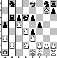 game notation in PGN-format [Event "Mal wieder spielen ?"] [Site "www.myChess.de"] [Date "2012.04.09"] [Round "1"] [White "espero"] [Black "beowulf"] [ECO "D00"] [WhitemyELO "1651"] [BlackmyELO "1382"] [Result "1-0"] [TimeControl "10/2592000"] [WhiteDays "49"] [BlackDays "59"] [MyChessNo "81034"] 1. d4 d5 2. Bf4 Bf5 3. e3 c6 4. c4 e6 5. Nc3 Bb4 6. Qb3 a5 7. Nf3 Be4 8. a3 Bd6 9. Bxd6 Qxd6 10. Nxe4 dxe4 11. Nd2 f5 12. Qxb7 Ra6 13. Qxg7 Rb6 14. c5 1-0 position notation in FEN-format 1n2k1nr/6Qp/1rpqp3/p1P2p2/3Pp3/P3P3/1P1N1PPP/R3KB1R - KQk - 0 14 Captured white pieces: Captured black pieces: Click on a captured piece in order to display the desired move!