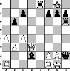 game notation in PGN-format [Event "1. Alexander Aljechin Turnier 2010"] [Site "www.myChess.de"] [Date "2010.09.01"] [Round "1"] [White "Seneca"] [Black "ClaudiaN"] [ECO "B02"] [WhitemyELO "1518"] [BlackmyELO "1622"] [Result "0-1"] [TimeControl "10/1728000"] [WhiteDays "15"] [BlackDays "13"] [MyChessNo "68058"] 1. e4 Nf6 2. e5 Nd5 3. c4 Nb6 4. b3 d6 5. Bb2 dxe5 6. Bxe5 Nc6 7. Bc3 e5 8. Qc2 Bc5 9. d3 O-O 10. Nf3 Nd4 11. Nxd4 exd4 12. Bb2 Bb4+ 13. Nd2 Qe7+ 14. Be2 Re8 15. Qd1 Qg5 16. O-O Bxd2 17. Bxd4 Bh3 18. Bf3 Rad8 19. Bxb6 axb6 20. Bxb7 Rxd3 21. Qc2 Rd6 22. Bf3 Bxg2 23. h4 Qxh4 24. Bxg2 Qf4 25. a4 Rh6 26. Qd3 Qh2# 0-1 position notation in FEN-format 4r1k1/2p2ppp/1p5r/8/P1P5/1P1Q4/3b1PBq/R4RK1 - - - 3 27 Captured white pieces: Captured black pieces: Click on a captured piece in order to display the desired move!