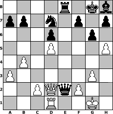game notation in PGN-format [Event "Herbstturnier 2025"] [Site "www.myChess.de"] [Date "2025.09.16"] [Round "1"] [White "Jonas84"] [Black "kalle"] [ECO "B70"] [WhitemyELO "1531"] [BlackmyELO "1623"] [Result "0-1"] [TimeControl "10/1728000"] [WhiteDays "59"] [BlackDays "52"] [MyChessNo "133670"] 1. e4 c5 2. Nf3 d6 3. d4 cxd4 4. Nxd4 Nf6 5. Nc3 g6 6. Bg5 Bg7 7. Be2 Qa5 8. O-O Qxg5 9. Ndb5 Na6 10. a3 O-O 11. g3 Bh3 12. Re1 Nc5 13. Bf3 Bd7 14. h4 Qe5 15. Nc7 Rac8 16. N7d5 Bc6 17. Qd2 Qe6 18. Qf4 Qd7 19. Rad1 Nxd5 20. exd5 Bb5 21. Nxb5 Qxb5 22. b4 Nd7 23. Rxe7 Be5 24. Qd2 Rce8 25. Rxe8 Rxe8 26. h5 Bh8 27. Be2 Qxe2 0-1 position notation in FEN-format 4r1kb/pp1n1p1p/3p2p1/3P3P/1P6/P5P1/2PQqP2/3R2K1 - - - 0 28 Captured white pieces: Captured black pieces: Click on a captured piece in order to display the desired move!
