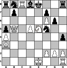 game notation in PGN-format [Event "Februar 2019"] [Site "www.myChess.de"] [Date "2019.02.12"] [Round "1"] [White "Winston"] [Black "Haneken"] [ECO "B01"] [WhitemyELO "1482"] [BlackmyELO "1066"] [Result "1-0"] [TimeControl "10/1728000"] [WhiteDays "59"] [BlackDays "50"] [MyChessNo "114320"] 1. e4 d5 2. e5 e6 3. d4 Bb4+ 4. c3 Ba5 5. b4 Bb6 6. Nf3 a5 7. b5 Bd7 8. a4 g6 9. Ba3 h5 10. c4 dxc4 11. Bxc4 c6 12. Nc3 cxb5 13. Bxb5 Qc8 14. Rc1 Nh6 15. Ne4 Qd8 16. Nf6+ Qxf6 17. exf6 Nf5 18. d5 e5 19. Nxe5 h4 20. Qe2 Bxb5 21. Rc8+ Bd8 22. Qxb5+ 1-0 position notation in FEN-format rnRbk2r/1p3p2/5Pp1/pQ1PNn2/P6p/B7/5PPP/4K2R - Kkq - 0 22 Captured white pieces: Captured black pieces: Click on a captured piece in order to display the desired move!