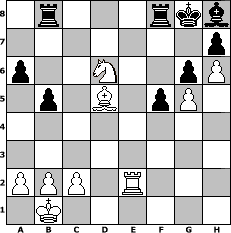 game notation in PGN-format [Event "Neujahrsturnier"] [Site "www.myChess.de"] [Date "2012.01.04"] [Round "1"] [White "Knight"] [Black "Seneca"] [ECO "D00"] [WhitemyELO "1295"] [BlackmyELO "1398"] [Result "1-0"] [TimeControl "10/1728000"] [WhiteDays "20"] [BlackDays "19"] [MyChessNo "78947"] 1. d4 d5 2. e4 dxe4 3. Nc3 Nf6 4. f3 exf3 5. Qxf3 g6 6. Be3 Bg7 7. h3 O-O 8. O-O-O c6 9. g4 Nbd7 10. Bg2 Nb6 11. g5 Nfd5 12. Nxd5 Nxd5 13. Ne2 Nxe3 14. Qxe3 e6 15. Nc3 Qc7 16. Kb1 e5 17. d5 cxd5 18. Rxd5 a6 19. h4 Be6 20. Rc5 Qb6 21. Rxe5 Qxe3 22. Rxe3 Rab8 23. Ne4 Bd5 24. h5 Bc6 25. h6 Bh8 26. Rhe1 Bd4 27. Rd3 Bh8 28. Re2 Bb5 29. Rdd2 Bxe2 30. Rxe2 b5 31. Nd6 f5 32. Bd5+ 1-0 position notation in FEN-format 1r3rkb/7p/p2N2pP/1p1B1pP1/8/8/PPP1R3/1K6 - - - 1 32 Captured white pieces: ![]() ![]() ![]() ![]() ![]() ![]() ![]() ![]() ![]() ![]() ![]() ![]() ![]() ![]() ![]() Captured black pieces: ![]() ![]() ![]() ![]() ![]() ![]() ![]() ![]() ![]() ![]() ![]() ![]() ![]() ![]() ![]() Click on a captured piece in order to display the desired move!