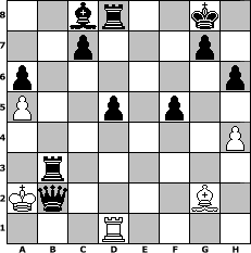 game notation in PGN-format [Event "Nuevo Relax 2010"] [Site "www.myChess.de"] [Date "2010.09.02"] [Round "1"] [White "Hobbykegler"] [Black "gambito"] [ECO "D01"] [WhitemyELO "1122"] [BlackmyELO "1655"] [Result "0-1"] [TimeControl "10/3456000"] [WhiteDays "122"] [BlackDays "032"] [MyChessNo "68080"] 1. d4 d5 2. Nc3 Nf6 3. Bf4 a6 4. Qd3 Nc6 5. O-O-O b5 6. Nf3 b4 7. Na4 e6 8. Nc5 Bxc5 9. dxc5 Ne4 10. Be3 Qe7 11. h4 Bb7 12. a3 f5 13. g3 Nxc5 14. Bxc5 Qxc5 15. Ng5 Bc8 16. Bg2 Rb8 17. a4 h6 18. Nf3 Qxf2 19. Bf1 O-O 20. b3 Rd8 21. Bh3 Qxg3 22. Rdg1 Qf4+ 23. Kb1 e5 24. Rf1 e4 25. Qd1 exf3 26. Rxf3 Qd4 27. Rd3 Qe4 28. c3 bxc3 29. Rg1 Nb4 30. Bg2 Qe5 31. a5 c2+ 32. Kc1 cxd1=Q+ 33. Rxd1 Nxd3+ 34. Rxd3 Qxe2 35. Rd2 Qe1+ 36. Rd1 Qc3+ 37. Kb1 Rxb3+ 38. Ka2 Qb2# 0-1 position notation in FEN-format 2br2k1/2p3p1/p6p/P2p1p2/7P/1r6/Kq4B1/3R4 - - - 2 39 Captured white pieces: Captured black pieces: Click on a captured piece in order to display the desired move!