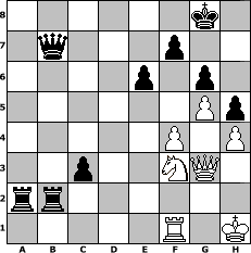 game notation in PGN-format [Event "Trotz Sturm und Regen die Figuren bewegen"] [Site "www.myChess.de"] [Date "2020.03.16"] [Round "1"] [White "Master1"] [Black "kalle"] [ECO "A45"] [WhitemyELO "1224"] [BlackmyELO "1640"] [Result "0-1"] [TimeControl "10/2592000"] [WhiteDays "30"] [BlackDays "30"] [MyChessNo "117550"] 1. d4 Nf6 2. e3 d5 3. Bd3 Nbd7 4. Nf3 c5 5. c3 g6 6. Nbd2 Bg7 7. O-O c4 8. Bc2 b5 9. Re1 Bb7 10. h3 O-O 11. e4 dxe4 12. Nxe4 e6 13. a3 Nxe4 14. Bxe4 Bxe4 15. Rxe4 Nf6 16. Re2 Nd5 17. Bg5 Qc7 18. Bh4 a5 19. Bg3 Qb7 20. Ne5 Rfc8 21. Rb1 Qe7 22. Qd2 Ra6 23. h4 h5 24. Nf3 b4 25. cxb4 axb4 26. axb4 Nxb4 27. Be5 Rca8 28. Ree1 Nd3 29. Bxg7 Nxe1 30. Rxe1 Kxg7 31. d5 Qf6 32. d6 Ra2 33. d7 Rd8 34. Ne5 Qe7 35. Nc6 Rxd7 36. Qc3+ Qf6 37. Ne5 Rc7 38. Rf1 Kg8 39. f4 Qd8 40. g4 Rb7 41. g5 Rbxb2 42. Qg3 Qb6+ 43. Kh1 Qb7+ 44. Nf3 c3 0-1 position notation in FEN-format 6k1/1q3p2/4p1p1/6Pp/5P1P/2p2NQ1/rr6/5R1K - - - 0 45 Captured white pieces: Captured black pieces: Click on a captured piece in order to display the desired move!