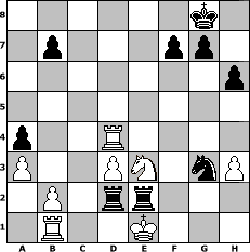game notation in PGN-format [Event "April 2018"] [Site "www.myChess.de"] [Date "2018.04.11"] [Round "1"] [White "wolni55"] [Black "sprinterde"] [ECO "C24"] [WhitemyELO "1415"] [BlackmyELO "1703"] [Result "0-1"] [TimeControl "10/1728000"] [WhiteDays "64"] [BlackDays "76"] [MyChessNo "111947"] 1. e4 e5 2. Bc4 Nf6 3. d3 c6 4. Nf3 Bc5 5. Nxe5 d5 6. exd5 cxd5 7. Bb3 Qe7 8. O-O O-O 9. Re1 Qc7 10. h3 Nc6 11. Nxc6 Qxc6 12. a3 Qb6 13. Be3 Bxe3 14. Rxe3 Bd7 15. Qf3 Ba4 16. Nd2 Bxb3 17. Nxb3 Rac8 18. Qe2 a5 19. Rb1 a4 20. Nc1 d4 21. Rf3 Qc5 22. Na2 Rfe8 23. Qd2 Qxc2 24. Qxc2 Rxc2 25. Nb4 Rd2 26. Rf5 Ree2 27. Rf4 h6 28. Rxd4 Rxf2 29. Nd5 Rxg2+ 30. Kf1 Nh5 31. Ne3 Ng3+ 32. Ke1 Rge2# 0-1 position notation in FEN-format 6k1/1p3pp1/7p/8/p2R4/P2PN1nP/1P1rr3/1R2K3 - - - 6 33 Captured white pieces: Captured black pieces: Click on a captured piece in order to display the desired move!