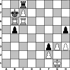 game notation in PGN-format [Event "Die Weinprobe Preis 1. Kiste guter Wein"] [Site "www.myChess.de"] [Date "2015.08.08"] [Round "1"] [White "Geisterreiter"] [Black "Winston"] [ECO "A06"] [WhitemyELO "1413"] [BlackmyELO "1450"] [Result "1-0"] [TimeControl "10/2592000"] [WhiteDays "108"] [BlackDays "112"] [MyChessNo "100002"] 1. Nf3 d5 2. h3 h6 3. e3 a6 4. d4 Bf5 5. Bd3 Bxd3 6. Qxd3 Nf6 7. Nc3 Nc6 8. a3 e6 9. Bd2 Bd6 10. e4 dxe4 11. Nxe4 Nxe4 12. Qxe4 Qd7 13. d5 Ne7 14. c4 exd5 15. cxd5 O-O-O 16. b4 Ng6 17. O-O Rde8 18. Qc4 Kb8 19. Be3 Rc8 20. Qd4 c5 21. Qxg7 cxb4 22. axb4 Bxb4 23. Qd4 Bc5 24. Ne5 Nxe5 25. Qxe5+ Bd6 26. Qb2 Ka8 27. Qb6 Bc5 28. Bxc5 Rxc5 29. Qxc5 f5 30. d6 f4 31. Qc7 Qxc7 32. dxc7 Rc8 33. Rfc1 Ka7 34. Rc4 f3 35. g3 b5 36. Rc6 h5 37. Raxa6+ Kb7 38. Rab6+ 1-0 position notation in FEN-format 2r5/1kP5/1RR5/1p5p/8/5pPP/5P2/6K1 - - - 2 38 Captured white pieces: Captured black pieces: Click on a captured piece in order to display the desired move!
