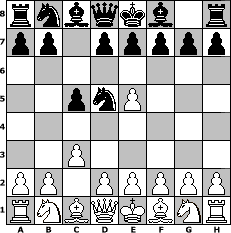game notation in PGN-format [Event "Die Weinlese"] [Site "www.myChess.de"] [Date "2016.09.01"] [Round "1"] [White "woern63"] [Black "Peterlie77 (C)"] [ECO "B22"] [WhitemyELO "2006"] [BlackmyELO "2126"] [Result "0-1"] [TimeControl "10/1728000"] [WhiteDays "00"] [BlackDays "19"] [MyChessNo "104643"] 1. e4 c5 2. c3 Nf6 3. e5 Nd5 0-1 position notation in FEN-format rnbqkb1r/pp1ppppp/8/2pnP3/8/2P5/PP1PPPPP/RNBQKBNR - KQkq - 1 4 Captured white pieces: Captured black pieces: Click on a captured piece in order to display the desired move!