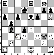 game notation in PGN-format [Event "Quicky-Blitz die Dritte"] [Site "www.myChess.de"] [Date "2009.08.02"] [Round "1"] [White "Schmalte"] [Black "Steffi"] [ECO "C24"] [WhitemyELO "1477"] [BlackmyELO "1486"] [Result "0-1"] [TimeControl "10/86400"] [WhiteDays "00"] [BlackDays "01"] [MyChessNo "58027"] 1. e4 e5 2. Bc4 Nf6 3. Qf3 Be7 4. Nc3 Nc6 5. a3 O-O 6. d3 d6 7. Be3 a6 8. h3 b5 9. Bd5 Nxd5 10. Nxd5 Bb7 11. Ne2 Re8 12. Qg4 Bc8 13. Qg3 Bf8 14. Qg5 f6 15. Qg3 Be6 16. Nb4 Nxb4 17. axb4 d5 18. c3 c6 19. f3 d4 20. cxd4 Bxb4+ 21. Nc3 exd4 22. Bh6 Qd7 0-1 position notation in FEN-format r3r1k1/3q2pp/p1p1bp1B/1p6/1b1pP3/2NP1PQP/1P4P1/R3K2R - KQ - 2 23 Captured white pieces: Captured black pieces: Click on a captured piece in order to display the desired move!