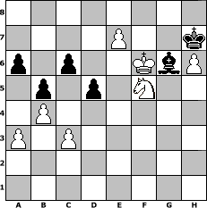 game notation in PGN-format [Event "Hitzesommer 2015.-Wir ziehen auch bei 40 Grad"] [Site "www.myChess.de"] [Date "2015.08.11"] [Round "1"] [White "Caligula"] [Black "Achimkogge"] [ECO "C34"] [WhitemyELO "1377"] [BlackmyELO "1499"] [Result "1/2-1/2"] [TimeControl "10/2592000"] [WhiteDays "23"] [BlackDays "30"] [MyChessNo "100054"] 1. e4 e5 2. f4 exf4 3. Nf3 Nf6 4. e5 Ng4 5. h3 Nh6 6. d4 d6 7. Bxf4 Nf5 8. Nc3 Be6 9. Bd3 Be7 10. O-O d5 11. Bxf5 Bxf5 12. Qe2 c6 13. Rac1 h6 14. a3 g5 15. Bd2 Bg6 16. b4 a6 17. Qf2 O-O 18. Rce1 Nd7 19. e6 Nf6 20. exf7+ Bxf7 21. Ne5 Be6 22. Nf3 Qd7 23. Re3 Nh5 24. Qe2 Nf4 25. Qe1 Rf6 26. Ne5 Qe8 27. Ref3 Nh5 28. Rxf6 Bxf6 29. g4 Nf4 30. Bxf4 gxf4 31. Rxf4 Kg7 32. Ne2 Bxe5 33. dxe5 Qe7 34. Qg3 Rh8 35. Nd4 Bd7 36. Qf3 Rf8 37. Rxf8 Qxf8 38. Qxf8+ Kxf8 39. Kf2 Kf7 40. Kf3 b5 41. Kf4 Ke7 42. h4 Kf7 43. g5 hxg5+ 44. Kxg5 Kg7 45. h5 Be8 46. Nf5+ Kh7 47. e6 Kg8 48. h6 Kh7 49. c3 Bg6 50. Kf6 Bh5 51. e7 Bg6 52. Nd4 Be8 53. Nf5 Bg6 54. Kg5 Be8 55. Kf6 Bg6 1/2-1/2 position notation in FEN-format 8/4P2k/p1p2KbP/1p1p1N2/1P6/P1P5/8/8 - - - 9 56 Captured white pieces: Captured black pieces: Click on a captured piece in order to display the desired move!