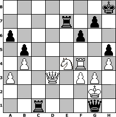 game notation in PGN-format [Event "Albspiele 17"] [Site "www.myChess.de"] [Date "2011.12.02"] [Round "1"] [White "Caligula"] [Black "Winston"] [ECO "D02"] [WhitemyELO "1362"] [BlackmyELO "1495"] [Result "0-1"] [TimeControl "10/864000"] [WhiteDays "50"] [BlackDays "40"] [MyChessNo "77888"] 1. d4 d5 2. Nf3 h6 3. e3 a6 4. c4 e6 5. cxd5 exd5 6. Bd2 Nf6 7. Bd3 c5 8. b3 b5 9. dxc5 Bxc5 10. O-O O-O 11. b4 Ba7 12. Bc3 Nc6 13. Nbd2 Bg4 14. h3 Bh5 15. Re1 d4 16. exd4 Nd5 17. Qb3 Nxc3 18. Qxc3 Nxd4 19. Nxd4 Bxd4 20. Qb3 Bxa1 21. Rxa1 Qd4 22. Re1 Kh8 23. Re4 Qb6 24. Rf4 Ra7 25. Qd5 Bg6 26. Bxg6 Qxg6 27. Qc5 Rfa8 28. Qe5 f6 29. Qe3 Qf7 30. a3 Re8 31. Ne4 Rae7 32. Qd3 Qf8 33. f3 Rd8 34. Qc2 Rc8 35. Qd3 Rc1+ 36. Kh2 Qb8 37. g3 Qb6 38. h4 h5 39. Kg2 Qg1+ 0-1 position notation in FEN-format 7k/4r1p1/p4p2/1p5p/1P2NR1P/P2Q1PP1/6K1/2r3q1 - - - 2 40 Captured white pieces: Captured black pieces: Click on a captured piece in order to display the desired move!