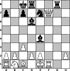 game notation in PGN-format [Event "1. Chess Cafe Meisterschaft 2017"] [Site "www.myChess.de"] [Date "2017.01.01"] [Round "1"] [White "mudb"] [Black "noma"] [ECO "C44"] [WhitemyELO "1111"] [BlackmyELO "1600"] [Result "1-0"] [TimeControl "10/3456000"] [WhiteDays "36"] [BlackDays "36"] [MyChessNo "106253"] 1. e4 e5 2. Nf3 Nc6 3. c3 d5 4. Bb5 dxe4 5. Bxc6+ bxc6 6. Nxe5 Bd6 7. Nxc6 Qd7 8. Qa4 Ne7 9. Qxe4 Bb7 10. Qd4 Qxc6 11. Qxg7 Rg8 12. Qxh7 Qxg2 13. Rf1 Be4 14. Qh4 Qxf2+ 15. Qxf2 O-O-O 16. Qxf7 1-0 position notation in FEN-format 2kr2r1/p1p1nQ2/3b4/8/4b3/2P5/PP1PP2P/RNB1KR2 - Q - 0 16 Captured white pieces: ![]() ![]() ![]() ![]() ![]() ![]() ![]() ![]() ![]() ![]() ![]() ![]() ![]() ![]() ![]() Captured black pieces: ![]() ![]() ![]() ![]() ![]() ![]() ![]() ![]() ![]() ![]() ![]() ![]() ![]() ![]() ![]() Click on a captured piece in order to display the desired move!