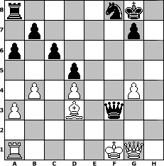 game notation in PGN-format [Event "Dabei ist alles 10"] [Site "www.myChess.de"] [Date "2010.09.12"] [Round "1"] [White "brucybabe"] [Black "Steffi"] [ECO "D02"] [WhitemyELO "1674"] [BlackmyELO "1584"] [Result "0-1"] [TimeControl "10/864000"] [WhiteDays "10"] [BlackDays "10"] [MyChessNo "68300"] 1. d4 d5 2. Nf3 e6 3. c4 Nf6 4. Nc3 c6 5. e3 Nbd7 6. Bd3 Bb4 7. O-O O-O 8. Qc2 dxc4 9. Bxc4 Nd5 10. e4 N5b6 11. Bd3 Re8 12. e5 h6 13. Be3 Nd5 14. Nxd5 exd5 15. a3 Ba5 16. b4 Bc7 17. Rfc1 a6 18. Qd2 Nf8 19. h3 Be6 20. Nh2 Qd7 21. g4 h5 22. f3 hxg4 23. Nxg4 Bxg4 24. hxg4 f6 25. exf6 Qd6 26. Re1 Qxf6 27. f4 Qh4 28. Qg2 Bxf4 29. Qf3 Qh2+ 30. Kf1 Bxe3 31. Rxe3 Rxe3 32. Qxe3 Qh1+ 33. Qg1 Qf3+ 0-1 position notation in FEN-format r4nk1/1p4p1/p1p5/3p4/1P1P2P1/P2B1q2/8/R4KQ1 - - - 3 34 Captured white pieces: Captured black pieces: Click on a captured piece in order to display the desired move!