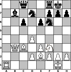 game notation in PGN-format [Event "Schachturnier Vier"] [Site "www.myChess.de"] [Date "2016.04.26"] [Round "1"] [White "FrankB"] [Black "Naunhofer"] [ECO "A46"] [WhitemyELO "1623"] [BlackmyELO "1629"] [Result "0-1"] [TimeControl "10/1728000"] [WhiteDays "00"] [BlackDays "19"] [MyChessNo "103429"] 1. d4 Nf6 2. Nf3 e6 3. c4 d5 4. a3 Be7 5. e3 O-O 6. Nc3 c6 7. Bd3 Nbd7 8. O-O dxc4 9. Bxc4 b5 10. Be2 Bb7 11. b4 a5 12. bxa5 Rxa5 13. Bb2 b4 14. axb4 Bxb4 15. Qb3 Bxc3 16. Bxc3 Rxa1 17. Rxa1 Qc8 0-1 position notation in FEN-format 2q2rk1/1b1n1ppp/2p1pn2/8/3P4/1QB1PN2/3PBPPP/R5K1 - - - 1 18 Captured white pieces: Captured black pieces: Click on a captured piece in order to display the desired move!