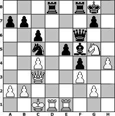 game notation in PGN-format [Event "Die Weinprobe 2017"] [Site "www.myChess.de"] [Date "2017.08.16"] [Round "1"] [White "reisinger"] [Black "Naunhofer"] [ECO "?"] [WhitemyELO "1454"] [BlackmyELO "1605"] [Result "0-1"] [TimeControl "10/1728000"] [WhiteDays "60"] [BlackDays "60"] [MyChessNo "109265"] 1. d4 Nf6 2. c4 e6 3. Nc3 d5 4. e3 c6 5. Qc2 Be7 6. Bd3 O-O 7. e4 dxe4 8. Nxe4 Nxe4 9. Bxe4 f5 10. Bd3 Qxd4 11. Be3 Bb4+ 12. Bd2 Bxd2+ 13. Qxd2 Nd7 14. Nf3 Qf6 15. O-O-O Nc5 16. Bc2 e5 17. h4 f4 18. Rhe1 Bg4 19. Bxh7+ Kxh7 20. Ng5+ Kg8 21. f3 Bf5 22. Qc3 Rad8 0-1 position notation in FEN-format 3r1rk1/pp4p1/2p2q2/2n1pbN1/2P2p1P/2Q2P2/PP4P1/2KRR3 - - - 3 23 Captured white pieces: Captured black pieces: Click on a captured piece in order to display the desired move!